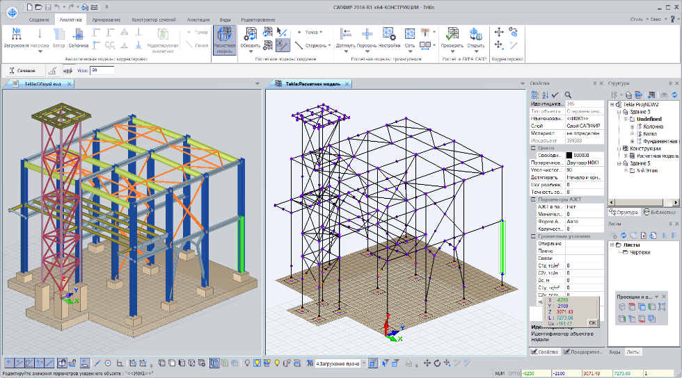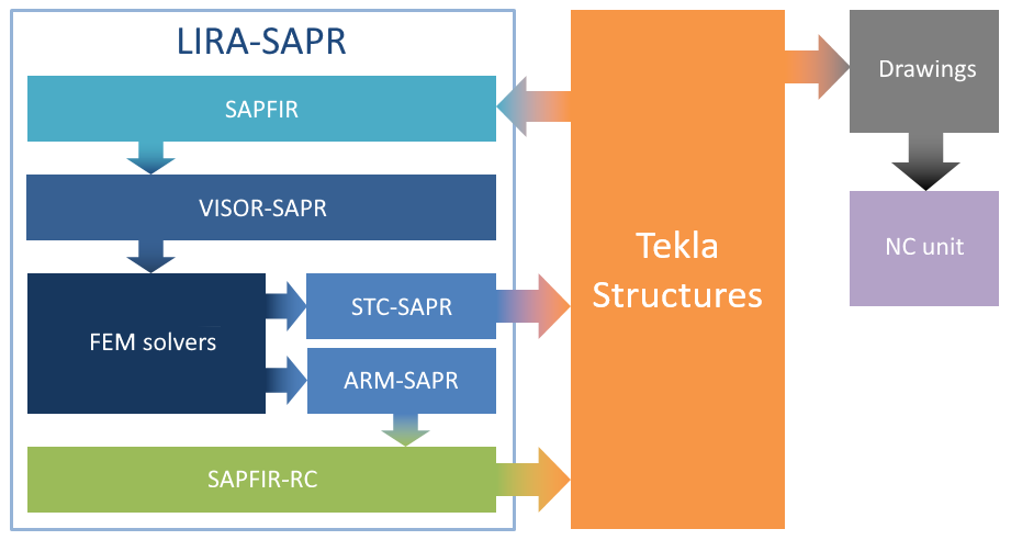 LIRA-FEM program supports two-way integration with Tekla Structures. The Tekla Structures analysis model may be directly transferred to VISOR-SAPR module. Bars, plates, hinges, restraints and loads may be transferred. In this way, steel frames may be successfully transferred for analysis. When all necessary data is added in LIRA-FEM program, you could carry out static & dynamic analyses, check/select sections of steel elements and transfer them back to Tekla Structures. Such technology is shown in Fig.1.<