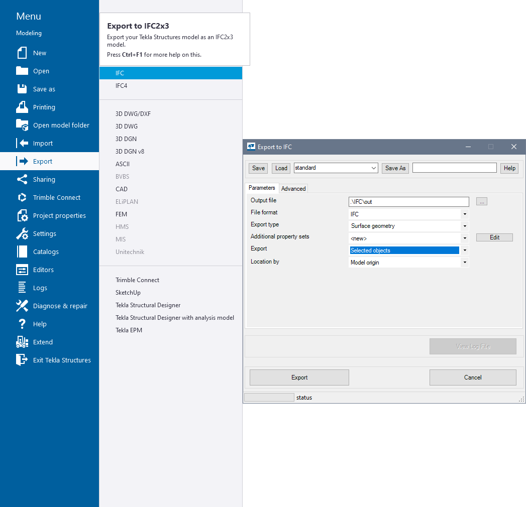 Click 'Export' and follow instructions in Tekla Structures. Then, the export model dialog box will appear (see Fig.6).