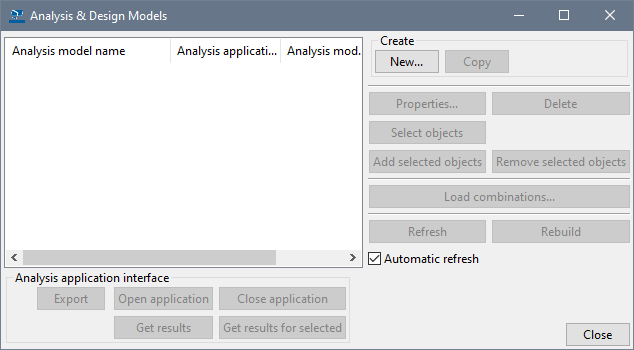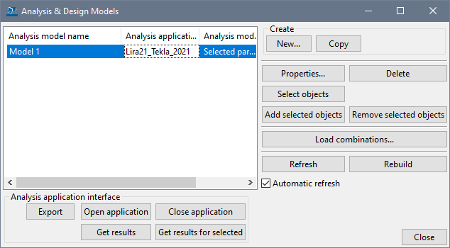 Then press 'OK'. Tekla Structures will generate the analysis model. Name of generated analysis model will appear in the 'Analysis & design models' dialog box (see Fig.5). When you select this row, the buttons in the 'Analysis application interface' area will become available.