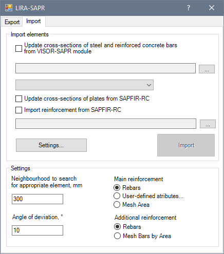 The settings for the import procedure include the neighbourhood and angular accuracy (angle of deviation) that will be applied to search for the most suitable bars in LIRA-FEM and walls/slabs in Design of RC structures module.