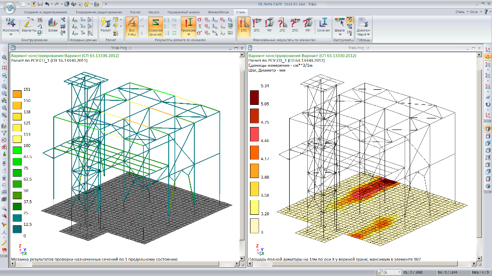 After analysis, updated cross-sections of bars and plate thicknesses are transferred from LIRA-FEM to Tekla Structures. During the work in LIRA-SAPR, the cross-sections of elements may be modified either by the program or by the user (selection of optimal steel sections according to obtained forces; modifications in RC sections because of the failure to meet the requirements for strength, stiffness or inability to arrange selected reinforcement) (see Fig.12).