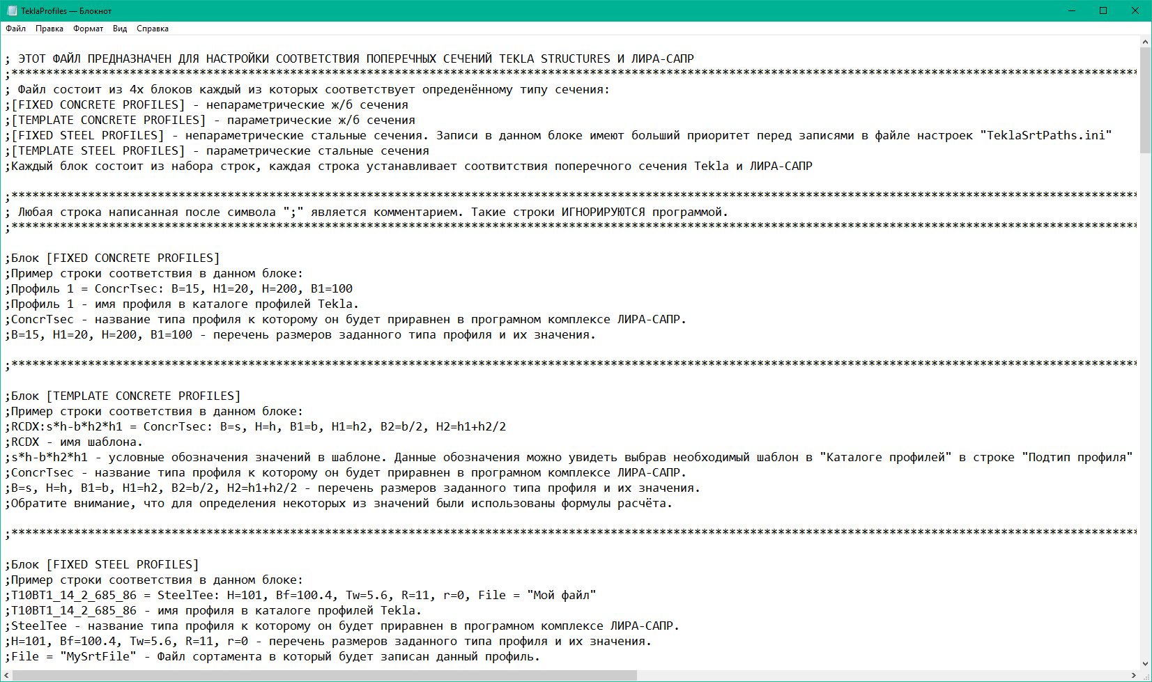 Steel tables available in Tekla Structures may be automatically exported and applied in LIRA-FEM analyses (see Fig. 6). When steel tables are exported, the table of correspondence between the Tekla Structures and LIRA-FEM profiles is used. By default, the TeklaProfiles.ini file for profile correspondence is located at C:\Users\Public\Documents\LIRA SAPR\LIRA SAPR 20XX\Settings. The TeklaSrtPaths.ini file for steel profile correspondence is also located there (see Fig.7). The table shows the LIRA-FEM profile that the Tekla Structures profile corresponds to. The table is provided with LIRA-FEM program. It is possible to edit the table manually.