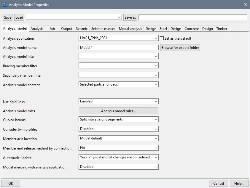 Then, in the 'Analysis application' box, select LiraXX_Tekla_XXXX, where XX and XXXX are the versions of LIRA-FEM and Tekla Structures.