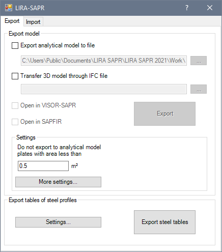 To import cross-sections of steel and RC bar elements, select the analysed LIRA-FEM file (file with *.lir extension) and design option.