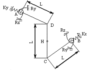 The 3D model consists of four bars. The horizontal bars lie orthogonally in two parallel horizontal planes and are connected by vertical bars that are hinged to each other (point H).