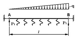 A beam on an elastic foundation subjected to mutually balanced concentrated forces applied at the ends and to a distributed load varying along the beam length according to a triangular law.