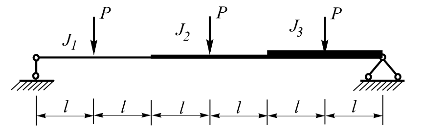 A simply supported stepped beam consisting of three segments with different stiffness properties is subjected to three concentrated loads (P). The beam has a single span and is hinged at both supports.