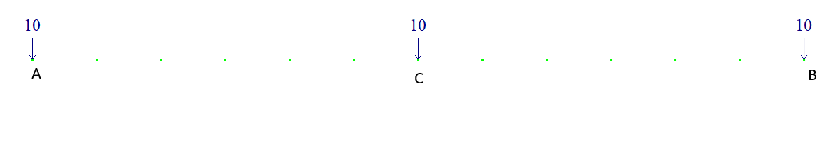 To determine the vertical displacements Z at the mid-span (point C) and at the beam ends (points A and B), the rotation angles UY at the beam ends, as well as the bending moment M at the mid-span of the beam.