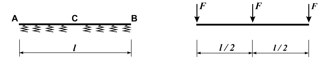 A beam resting on an elastic horizontal foundation with constant stiffness along its length. A beam is subjected to three concentrated vertical forces of equal value F, applied at the beam ends (points A and B) and at the mid-span (point C).