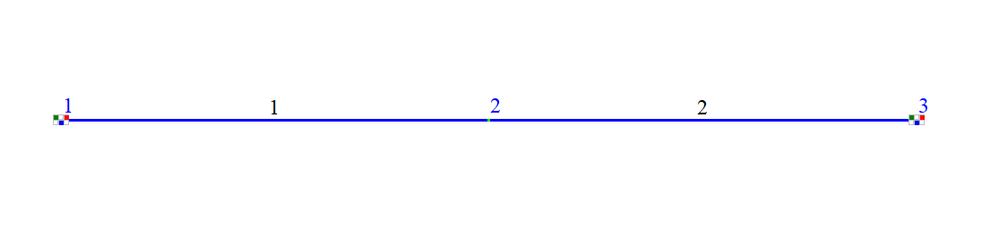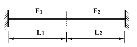 The system consists of two coaxial horizontal bars with square cross-sections, rigidly connected at a common node and rigidly fixed at the opposite end nodes.