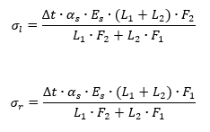 In the analytical solution, the normal stresses in the cross-sections of the system’s bars are determined by the following formulas: