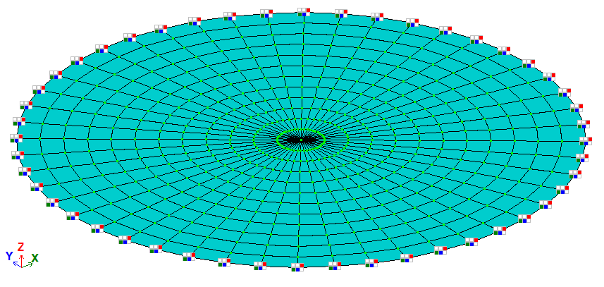 The local axes of the plate elements for result evaluation are oriented so that the Y1-axis is directed towards the centre of the circle (the Z1-axis is directed upwards).
