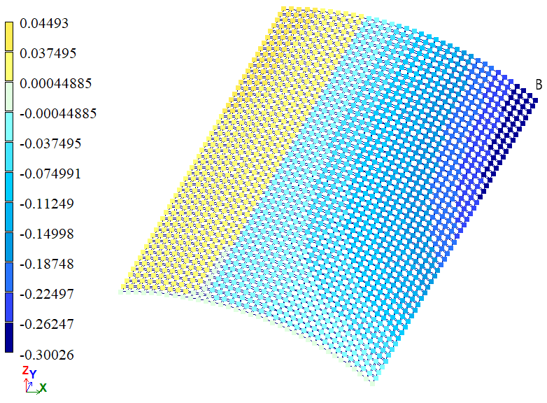 Fixed displacements and rotations along the arc edge AD and at the opposite end – restraints are applied in the directions of DOF X, Z, uY (u=0, w=0, θY=0).