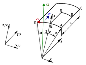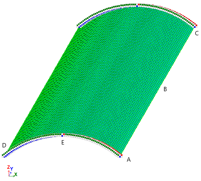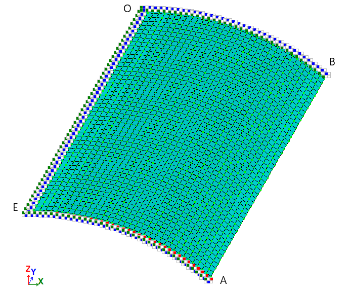 Fixed displacements and rotations along the arc edge AE – restraints are applied in the directions of DOF X1, Z1, uY1 (u=0, w=0, θY=0).