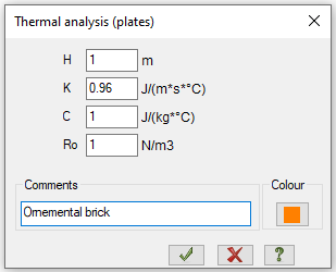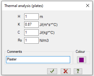 Let's define the corresponding thermal conductivity coefficients K on the wall layers. The values of Specific heat C and Density R0 are not used in the steady-state analysis, therefore they can be defined as equal to units.