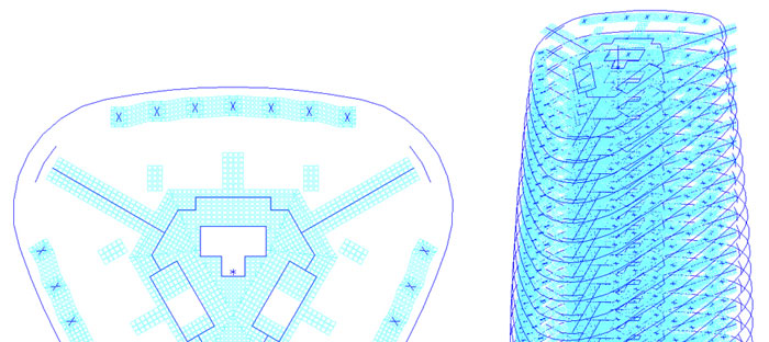 Evrika! (а ведь еще вначале была идея) - не все же меняется (!), а только удаление рядов колонн от ядра, да масштаб контура перекрытия. Ядро – вообще постоянно (на то оно и ядро). Итак, регулярность на опорах достигается ручной триангуляцией, а образовавшиеся пустоты зашиваем автоматическим триангулятором в ЛИРЕ. Спустя 2 часа сетка над ядром и рядами колонн затриангулирована в AutoCAD (при помощи 3DFACE) (Рис. 6).
