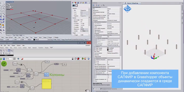 Создание и управление BIM элементами в САПФИР напрямую из Grasshopper. Видео демонстрирует как подключить компоненты САПФИР-3D к Grasshopper, а также как создавать объекты САПФИР и возможности управления ими с помощью данного плагина.