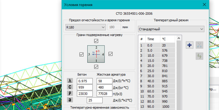 Главной задачей при расчете конструкций на огнестойкость есть обеспечение несущей способности на протяжении заданного промежутка времени. При расчете на огнестойкость в ЛИРА-САПР проводится подбор и проверка арматуры в соответствии с пониженными характеристиками бетона и арматуры на заданном промежутке времени огневого воздействия.