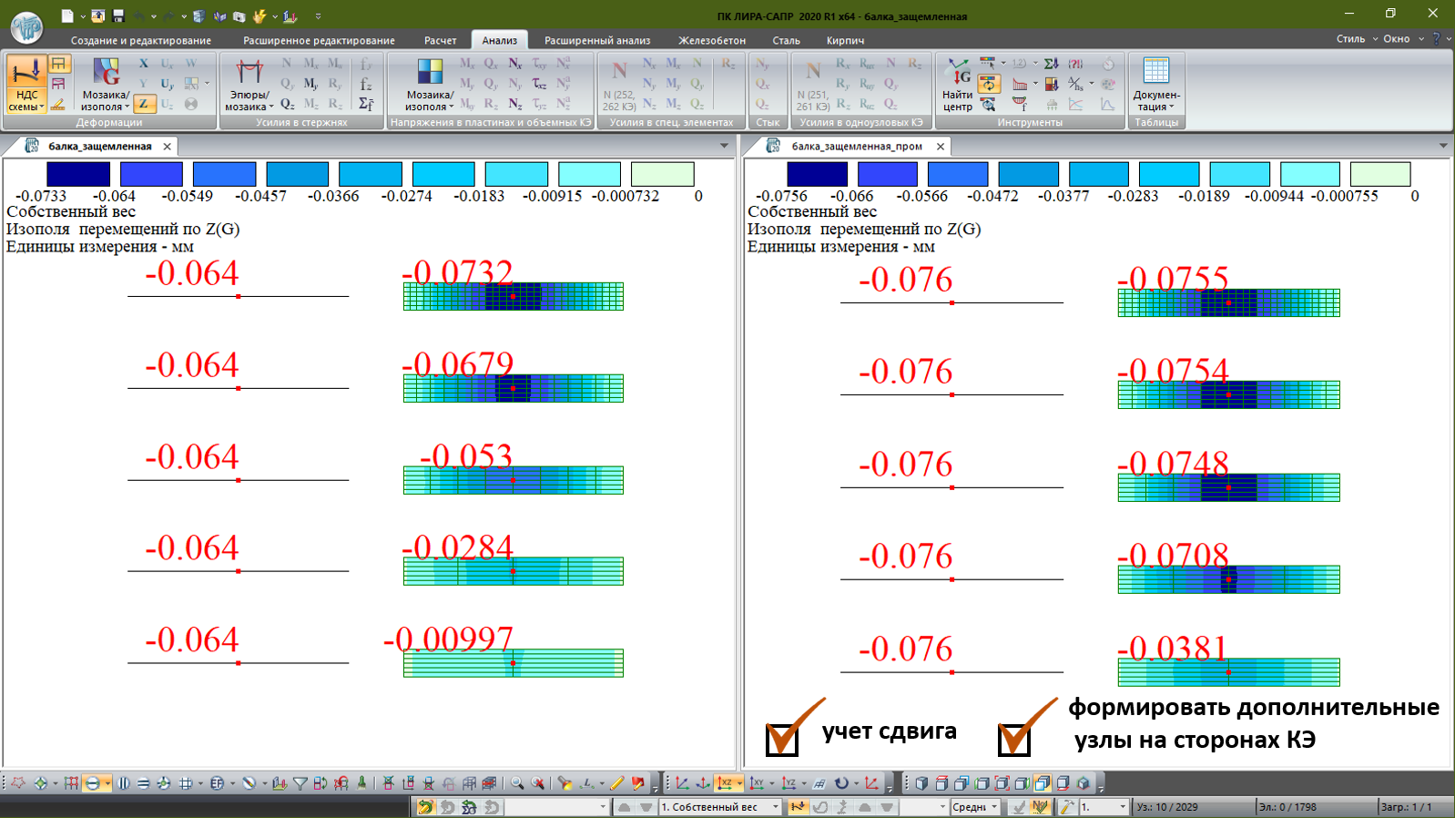 При этом следует отметить, что при таком соотношении пролета и высоты сечения необходимо учитывать сдвиговую составляющую деформации. И если выполнить расчет для пластин с еще большим сгущением сети, либо выполнить расчет с высокоточными элементами, т.е. установить опцию формировать дополнительные узлы на сторонах КЭ перед расчетом, а для стержневых элементов установить «Учет сдвига», то вертикальные перемещения в середине пролета балки как для стержней, так и для пластин возрастут и будут практически совпадать (рис. 3).