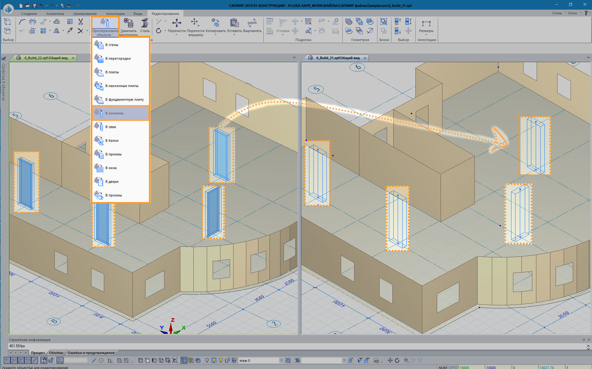 Рис.8. Преобразование объектов (стены) в колонны