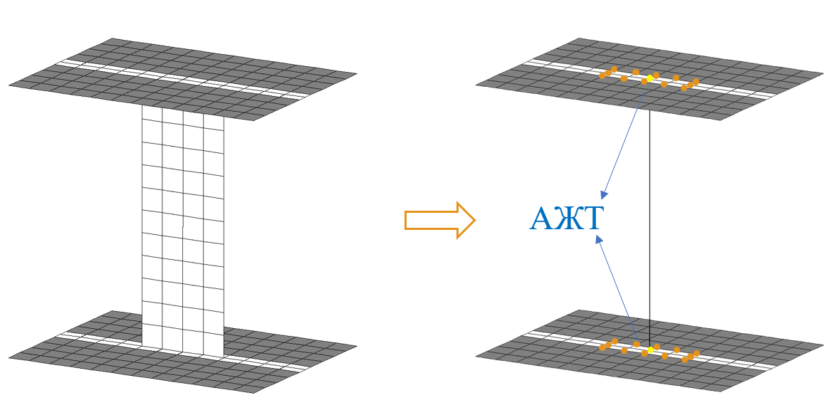 Если моделировать такие конструктивные элементы стержнями, обеспечивая их совместную работу в общей конструктивной схеме здания при помощи абсолютно жестких тел (АЖТ), то такие конечно-элементные модели, позволяют, сократить размерность решаемых задач, а также, обеспечивают получение усилий в сечениях элемента в виде удобном для анализа и дальнейшего конструирования (рис. 4).