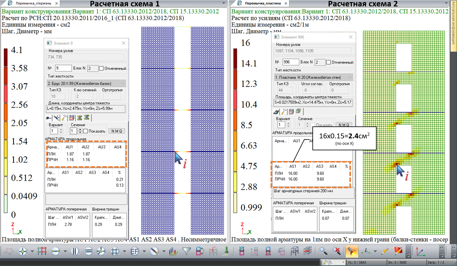 Рис.7. Результаты подбора арматуры: а) перемычка моделируется стержнем; б) перемычка моделируется пластинами