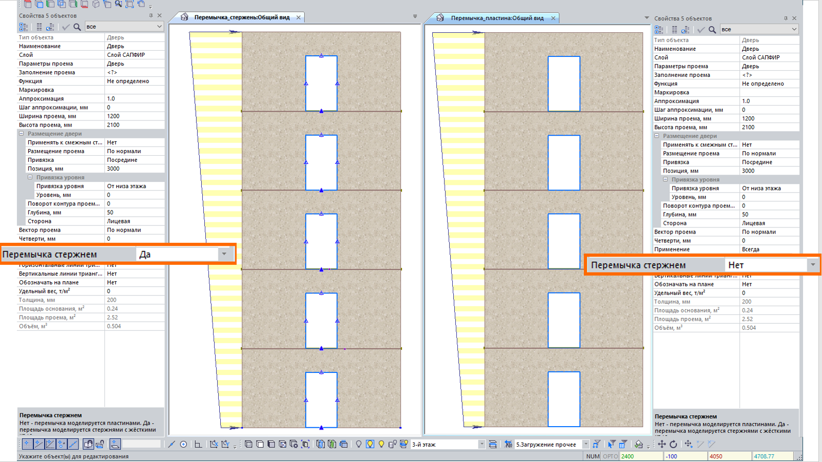 Для монолитных и панельных зданий, при выборе соответствующей опции, реализовано автоматическое моделирование области над и под оконным или дверным проемом в виде стержня (перемычки).