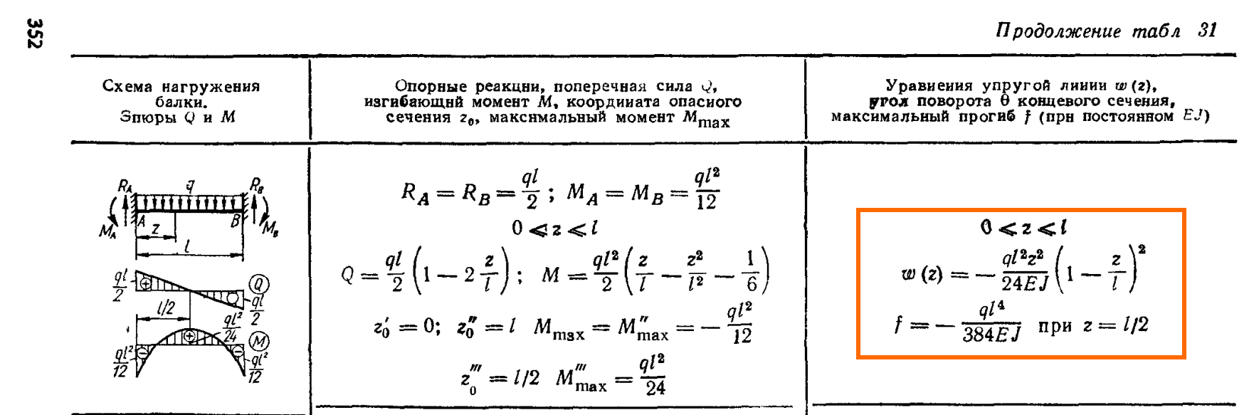 Аналитическом решении прогиб в центре защемленной по концам балки (равномерно-распределенной нагрузкой).png