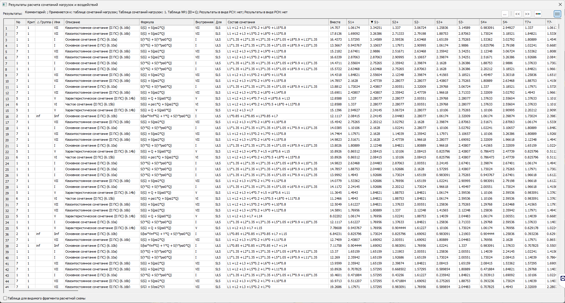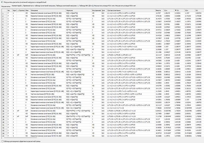 Однако бывают случаи когда требуется получить результат по какому-то вполне определённому сочетанию независимо от того, будет ли оно вызывать максимум какого-то критерия или нет. В этом случае в новом инструменте Сочетания нагрузок и воздействий следует задать так называемое «некритериальное» сочетание. Задание такого сочетания соответствует заданию сочетания из системы расчётных сочетаний нагрузок (РСН). В одной и той же таблице сочетаний могут содержаться как критериальные сочетания, то есть сочетания соответствующее сочетаниям РСУ, так и некритериальные сочетания, то есть соответствующее сочетаниям РСН. Кроме этого, к таблице сочетаний могут быть присоединенные сочетания из других задач, то есть сочетания системы МЕТЕОР.