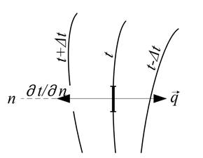 Тепло самопроизвольно переносится только в сторону убывания температуры. Количество тепла, переносимое через какую-либо изотермическую поверхность в единицу времени, называется тепловым потоком Q [1].