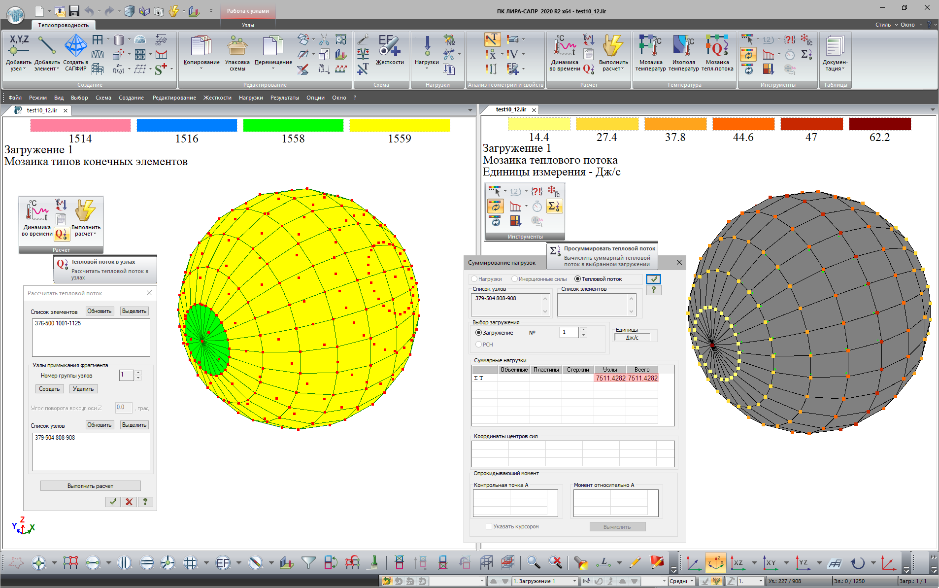 Для определения теплового потока, проходящего через стенку при стационарном тепловом состоянии, необходимо выполнить суммирование теплового потока в узлах. Для этого выделяем узлы, в которых был ране вычислен тепловой поток и в диалоговом окне Суммирование нагрузок нажимаем кнопку Применить (рис.10).