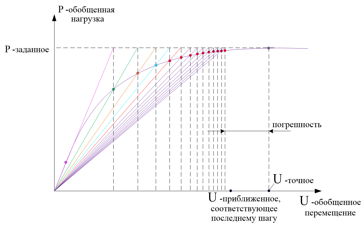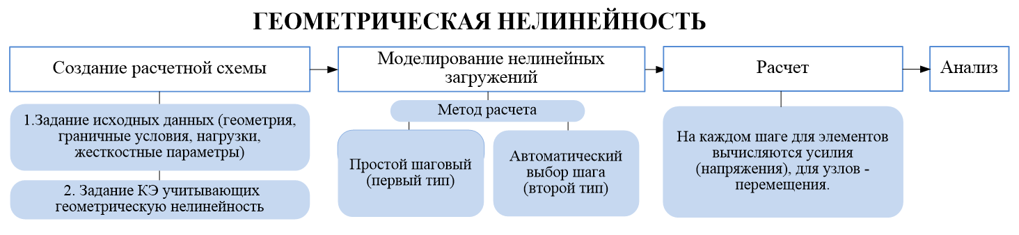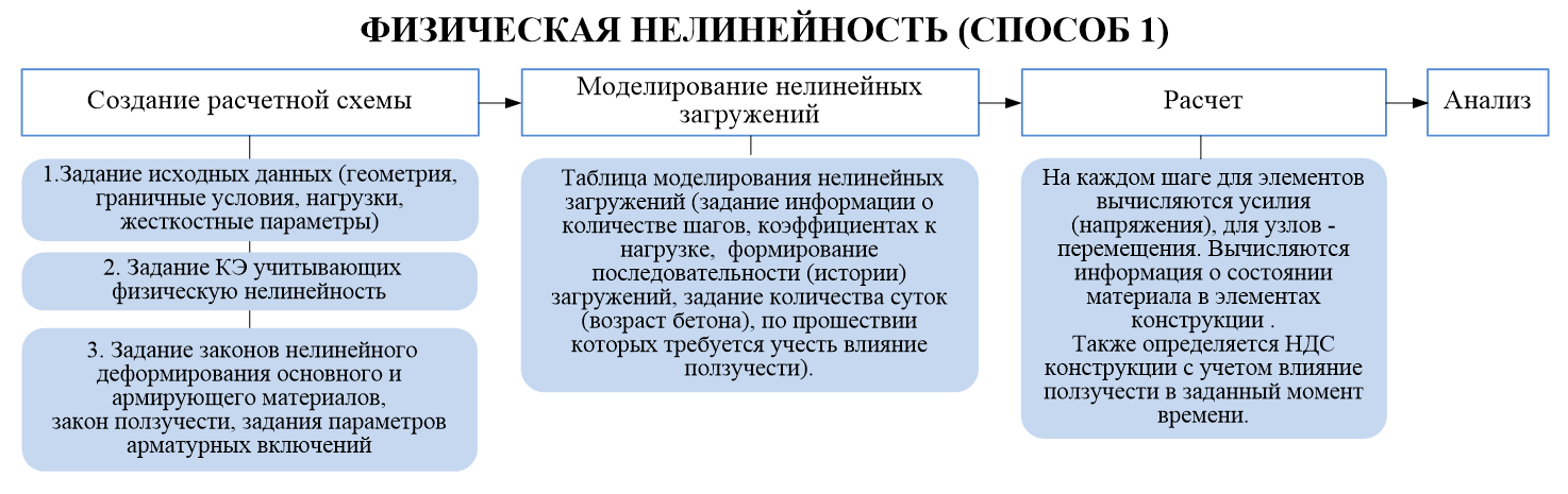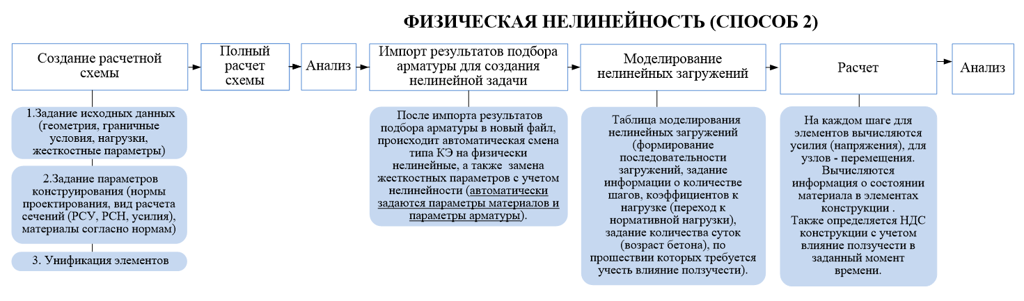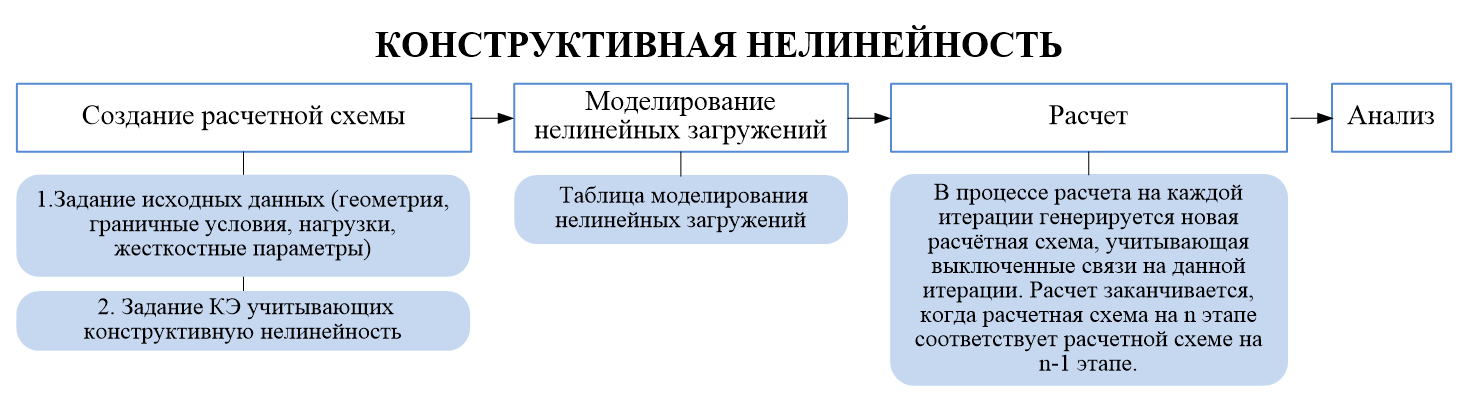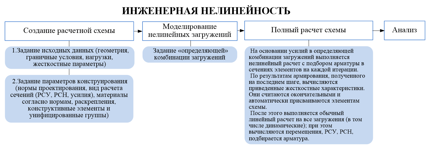 Такой подход очень трудоемкий. Расчет в нелинейной постановке используется как правило для исследования работы уникальных конструкций не имеющих аналогов. Для косвенного учета нелинейных свойств конструкции разработан метод инженерная нелинейность, который позволяет определить пониженную жесткость элементов с последующим проведением расчета по традиционной схеме.