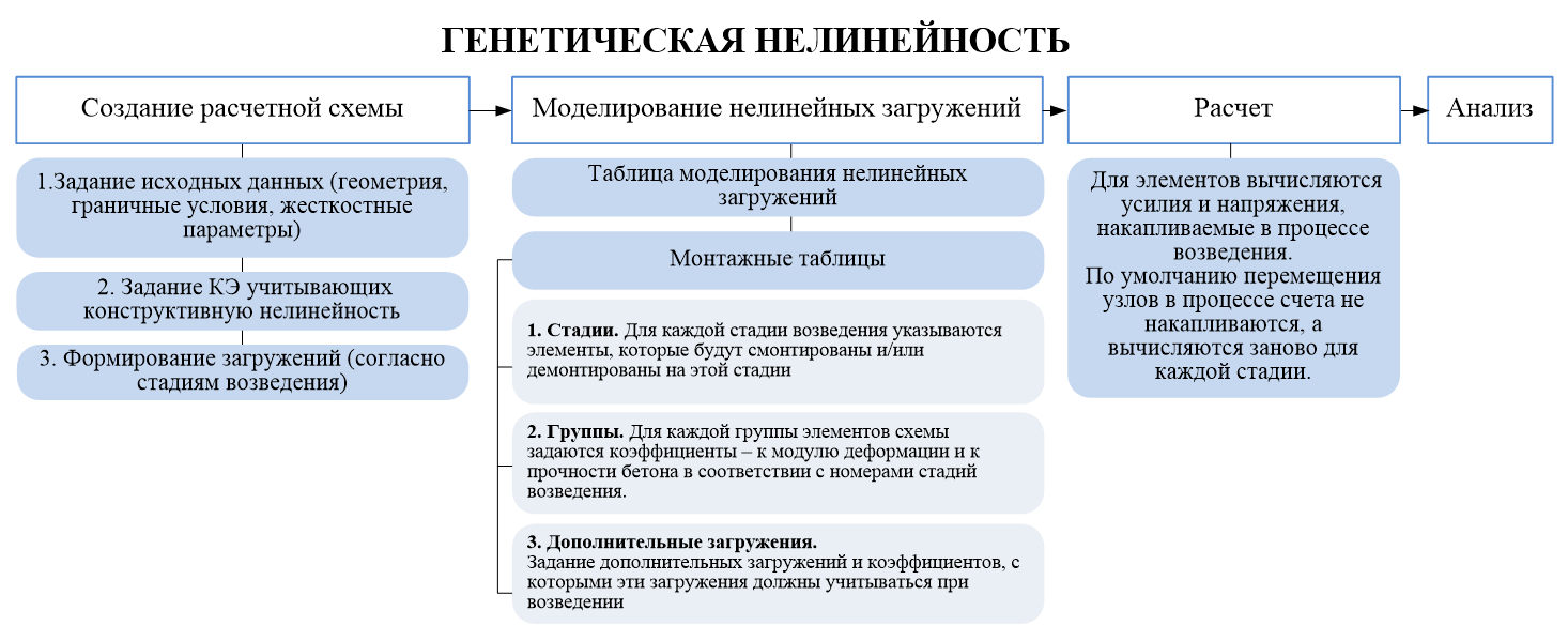 Учет нелинейной работы конструкции позволяет осуществлять построение адекватных расчетных схем, выявлять дополнительные резервы несущей способности, снижать материалоемкость обеспечивать конструктивную безопасность, осуществлять моделирование процессов жизненного цикла конструкций – процесс нагружения, процесс возведения, процесс изменения НДС конструкции во времени, устойчивость от прогрессирующего обрушения.