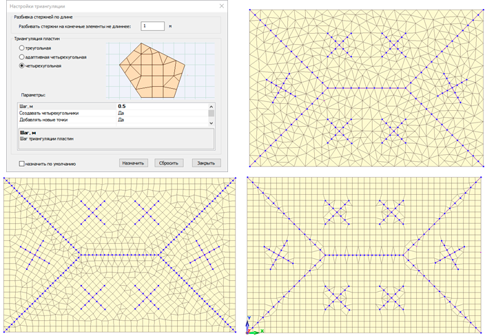 Рис. 3. Настройки триангуляции и результат генерации различных сеток: треугольной, адаптивной четырехугольной – слева и четырехугольной – справа