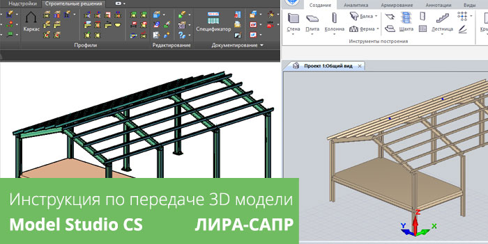 Существует возможность передачи 3D модели здания и данных по нему из программного комплекса Model Studio CS Строительные решения в программный комплекс ЛИРА-САПР для прочностного анализа конструкции методом конечных элементов.