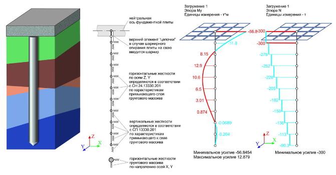 В ЛИРА-САПР 2016 появилась возможность моделирования сваи цепочкой вертикальных стержней. Это позволяет далее получить эпюры усилий N, My, Mz, Qy,Qz по всей длине сваи и выполнить подбор арматуры. Верхний стержень цепочки – огловок сваи – может моделировать шарнирное или жесткое прикрепление фундаментной плите.