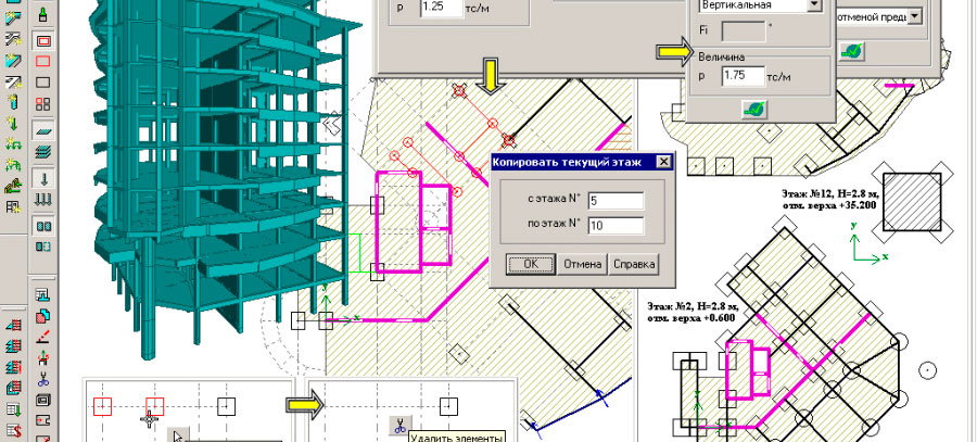 В процессе построения расчетной модели использовались такие элементы как: сети, оси, колонны, капители, стены, плиты перекрытия, фундаментные плиты, сваи, балки, перегородки. Задание нагрузок в виде сосредоточенных сил, линейной нагрузки, нагрузки штамп, сейсмическое и ветровое воздействие.