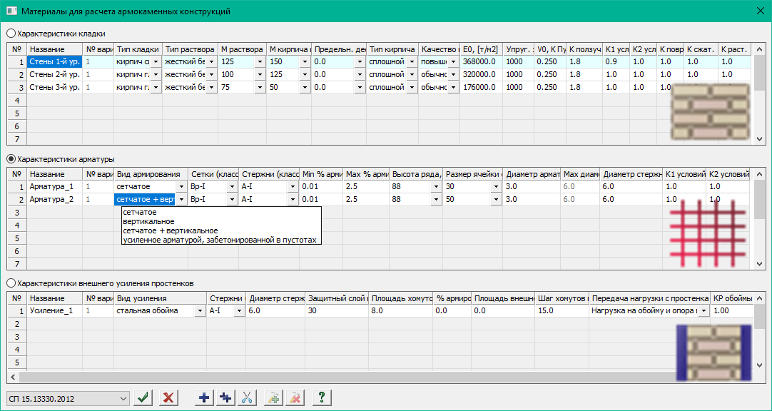 Диалоговое окно задания материалов для расчета армокаменных конструкций