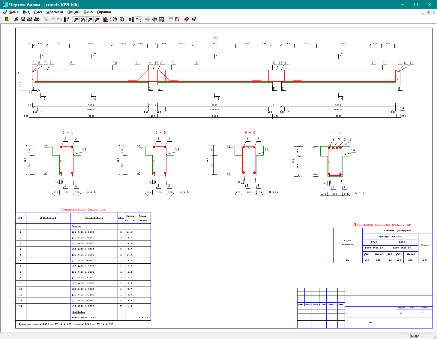 Для получения чертежа балки, выполните пункт меню Результаты - Чертеж. В результате откроется Чертеж Балки.