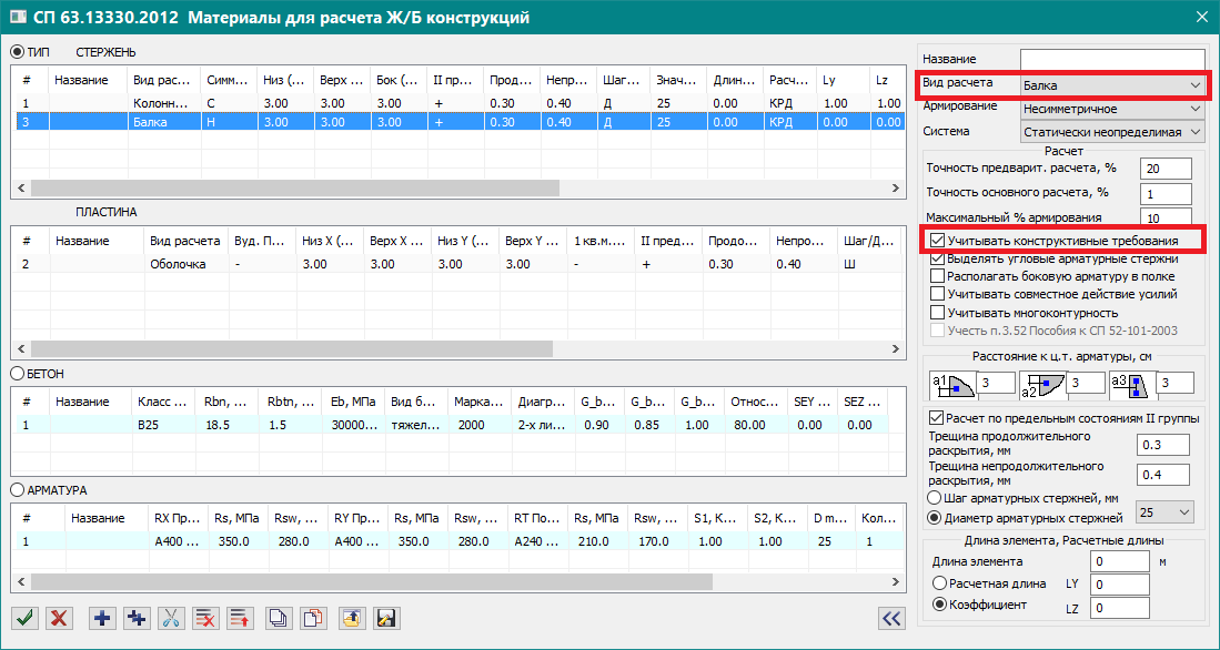 Для этого при задании параметров для железобетонных конструкций стержневых элементов нужно выбрать вид Балка в раскрывающемся списке Вид расчета и установить флажок Учитывать конструктивные требования в поле Расчет.