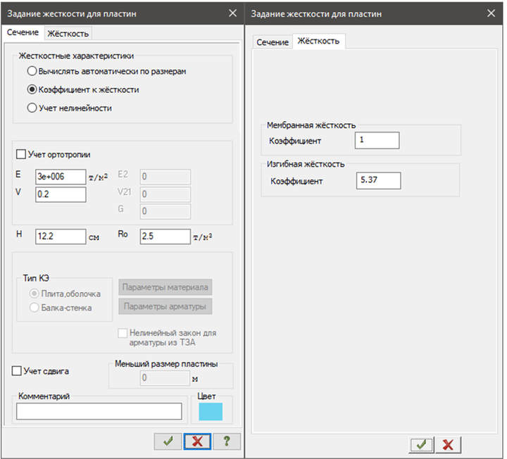 Для корректировки жёсткости плиты, можно воспользоваться функцией умножения жёсткости на коэффициент (доступно начиная с версии ЛИРА САПР 2019). Определим коэффициент, на который следует умножить изгибную жёсткость плиты: