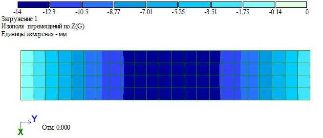 Как видно, по результатам расчёта, прогиб плиты примерно соответствует прогибу при испытаниях. Небольшая разница (0.4 мм) объясняется тем, что в расчётной модели пролёт плиты принят не 7.15 м, как при испытаниях, а 7.2 м.