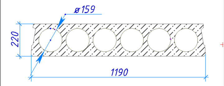 Это наиболее простой случай моделирования многопустотных плит. От пользователя требуется только посчитать собственный вес плиты перекрытия. Этот параметр можно посмотреть в типовой серии на железобетонное изделие, или на сайте завода-изготовителя. Полученную величину следует привести к погонному весу, т.е. определить, сколько весит один погонный метр плиты перекрытия. Для плиты, изображённой на рисунке выше, погонный вес равен g=0.342 тс/м.