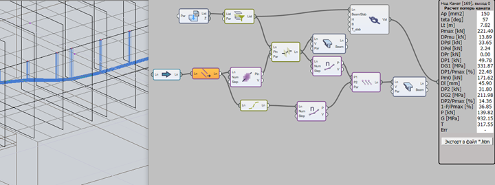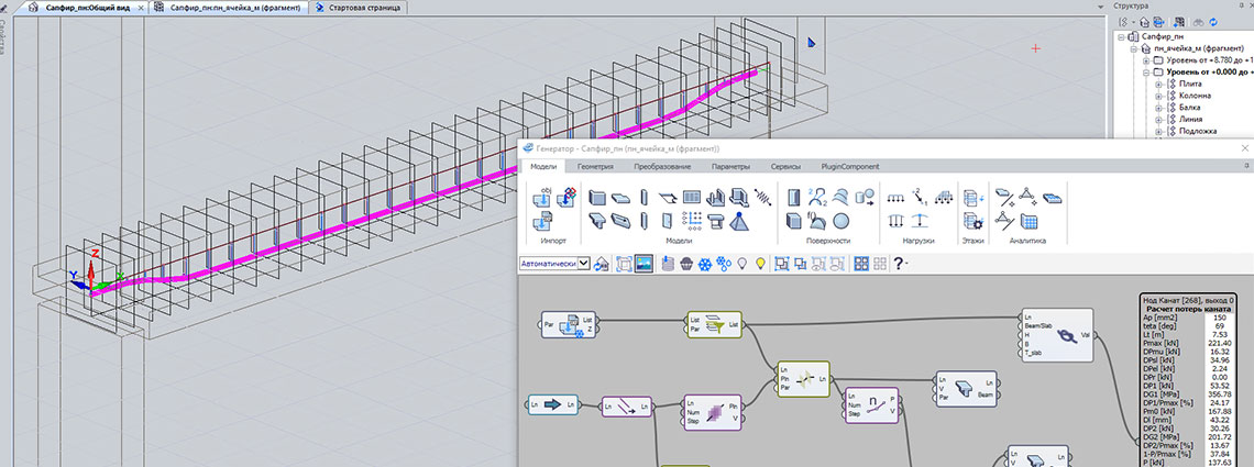 После знакомства с методикой прямого моделирования и расчета постнапряжения канатной арматуры, описанной в публикации ООО «ДАКК» было решено изучить возможность использования данной методики в практике СибТехПроекта. Основным инструментом расчетов стал расчетный модуль “Канат” (Тут и далее по тексту имеется в виду нод Канат в системе САПФИР-Генератор, дающий возможность учесть постнапряжение в железобетонных элементах с канатной арматурой. - Прим. ред.), реализованный в ПК САПФИР версии 2020 - с помощью этого модуля стало возможным рассчитать требуемую температуру в канате в зависимости от геометрии раскладки, прочности и сечения.