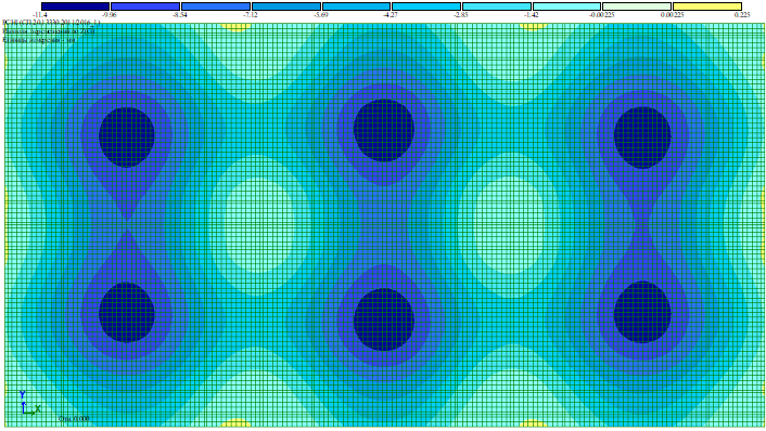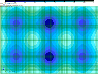 В ходе нескольких итераций в ЛИРА-САПР связанных с подбором сечения напрягаемых канатов и шириной балок, была получена форма перекрытия, прогибы которой представлены на рис.9.