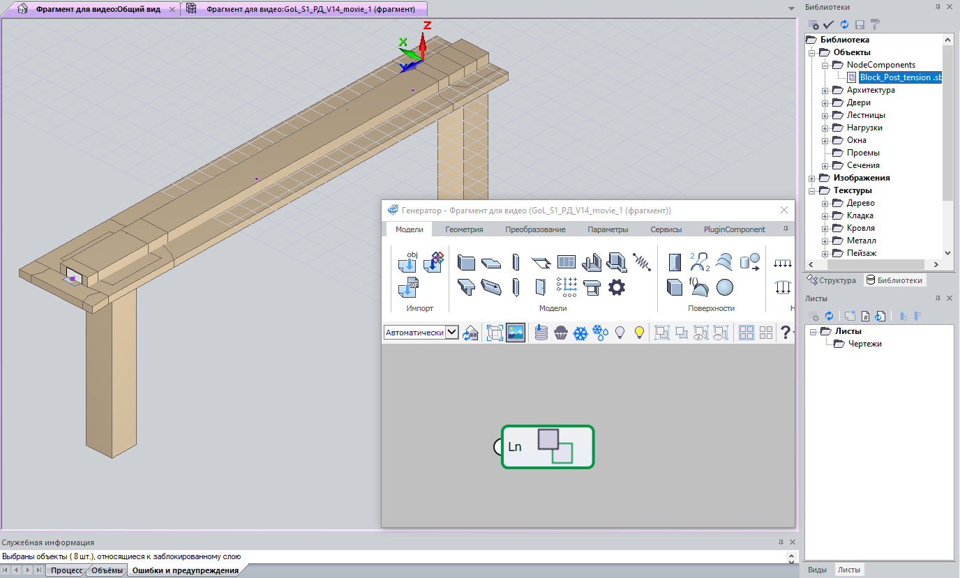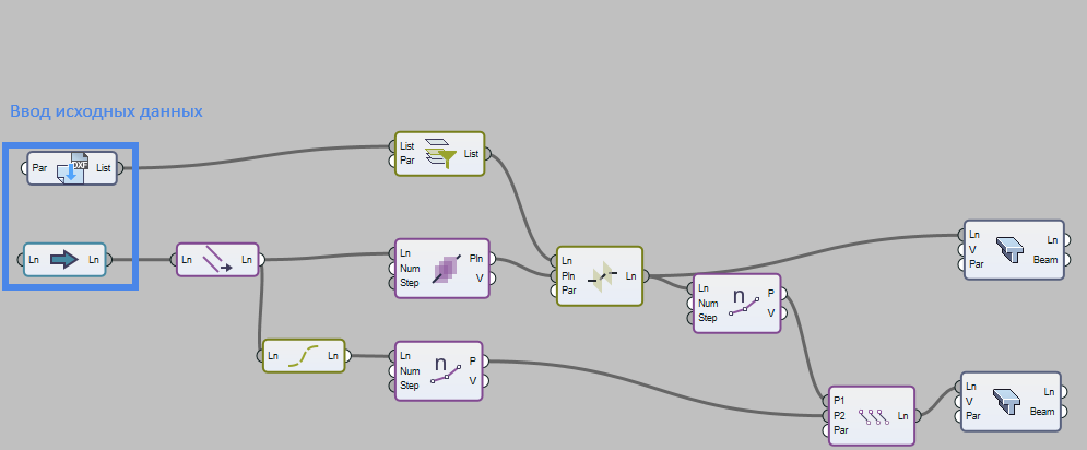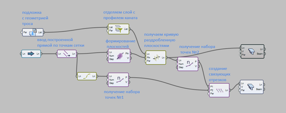 В препроцессоре используем систему визуального программирования САПФИР-Генератор и подгружаем готовый блок нодов (рис.2). Целью данной цепочки нодов является автоматизация проектирования канатной арматуры, а именно образование «связующих» стержней, которые служат для передачи усилий от натяжения на конструкцию.