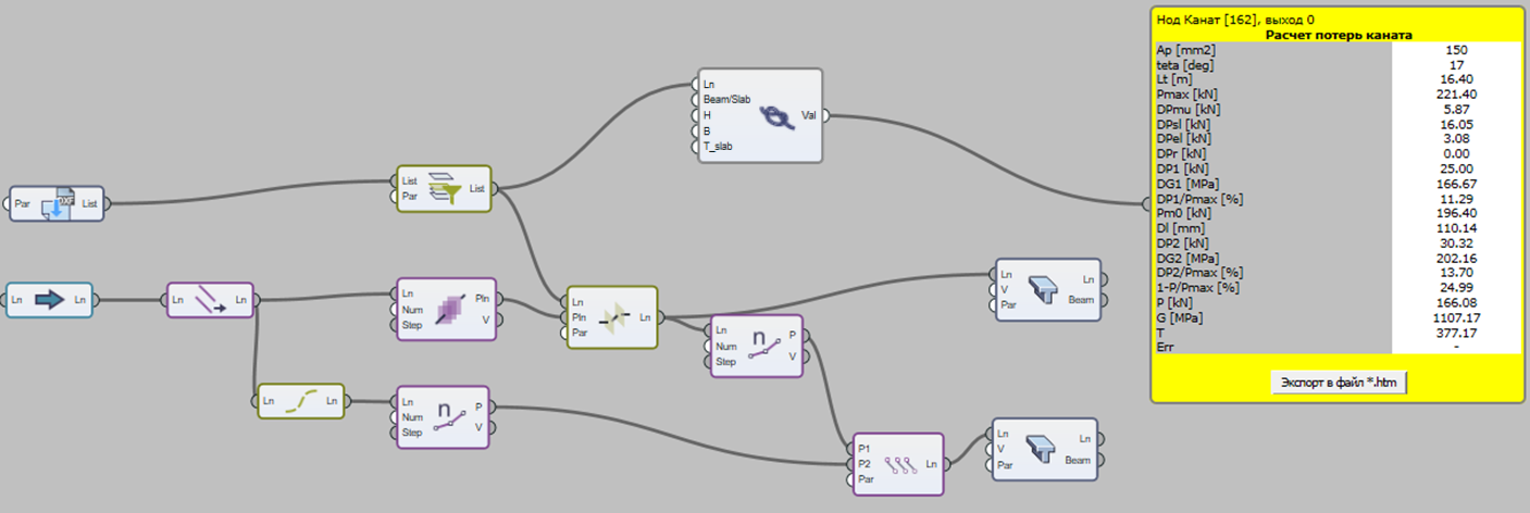 После создания каната и КЭ10 рассчитываем потери пост-напряжения используя специальный новый нод, к которому на вход подаем параболу, а остальные параметры, связанные с бетоном и арматурой, заполняем в свойствах нода. Нод подсчитывает угловые потери от трения каната и учитывает все исходные данные и выводит результат в табличной форме, которую можно сохранить в формате *.HTML (рис.8).