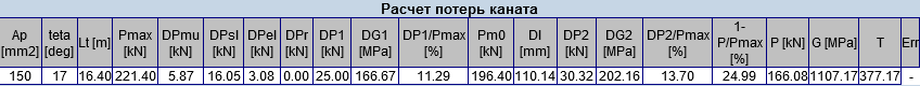 В таблице выведены все ключевые параметры, которые необходимо контролировать инженеру, такие как: сечение каната Ар (мм), сумма угловых перемещений θ (°), длина троса Lt (м), максимальное напряжение Pmax (кН), составляющие потерь 1-го рода ∆Pmu, ∆Psl, ∆Pel, ∆Pr (кН) и сумма потерь 1-го рода ∆P1 (кН, %), начальная сила напряжения Pm0, (кН), относительное удлинение троса ∆L (мм), потери 2-го рода ∆P2 (кН, %), общие потери (%), натяжение и усилие в тросе после всех потерь P (кН) и σ (МПа), температурное выражение напряжения после всех потерь Т (С°).