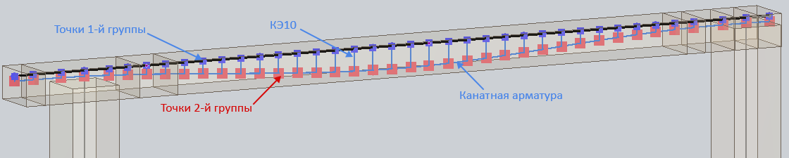 В ВИЗОР-САПР задаем натяжение каната посредством нагрузки равномерного нагрева на стержни, переназначаем балки сечением 5х5(мм) в КЭ10 (если не выполнили это в САПФИРе), и в результате получаем схему с пост-напряженными конструкциями готовую к расчету и анализу.