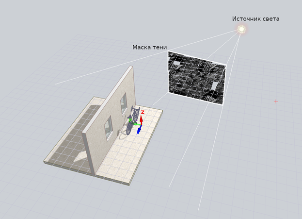 Чтобы определить такие места, программа «смотрит» на сцену с позиции источника и выстраивает картину, что видно, а что нет. Такая картина называется «маска тени» (см. Рис. 1). Маска тени растровая. Разрешение растра ограничено, поэтому при охвате значительных пространств заметны «зубчики» на краях тени.